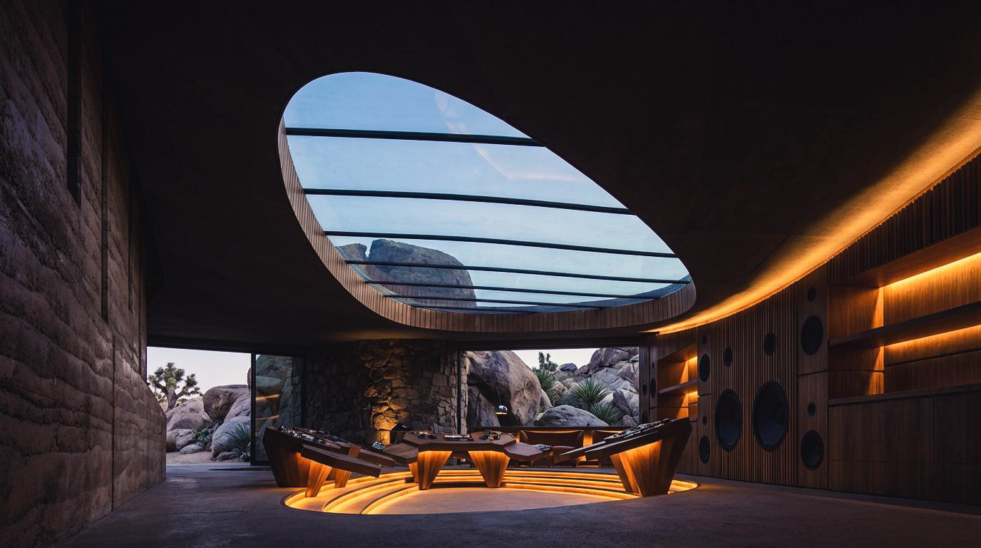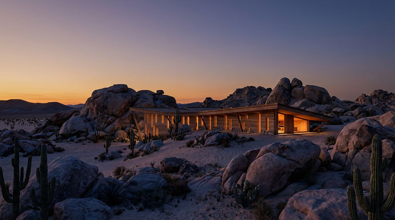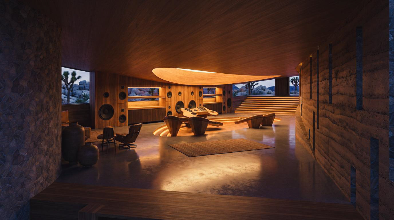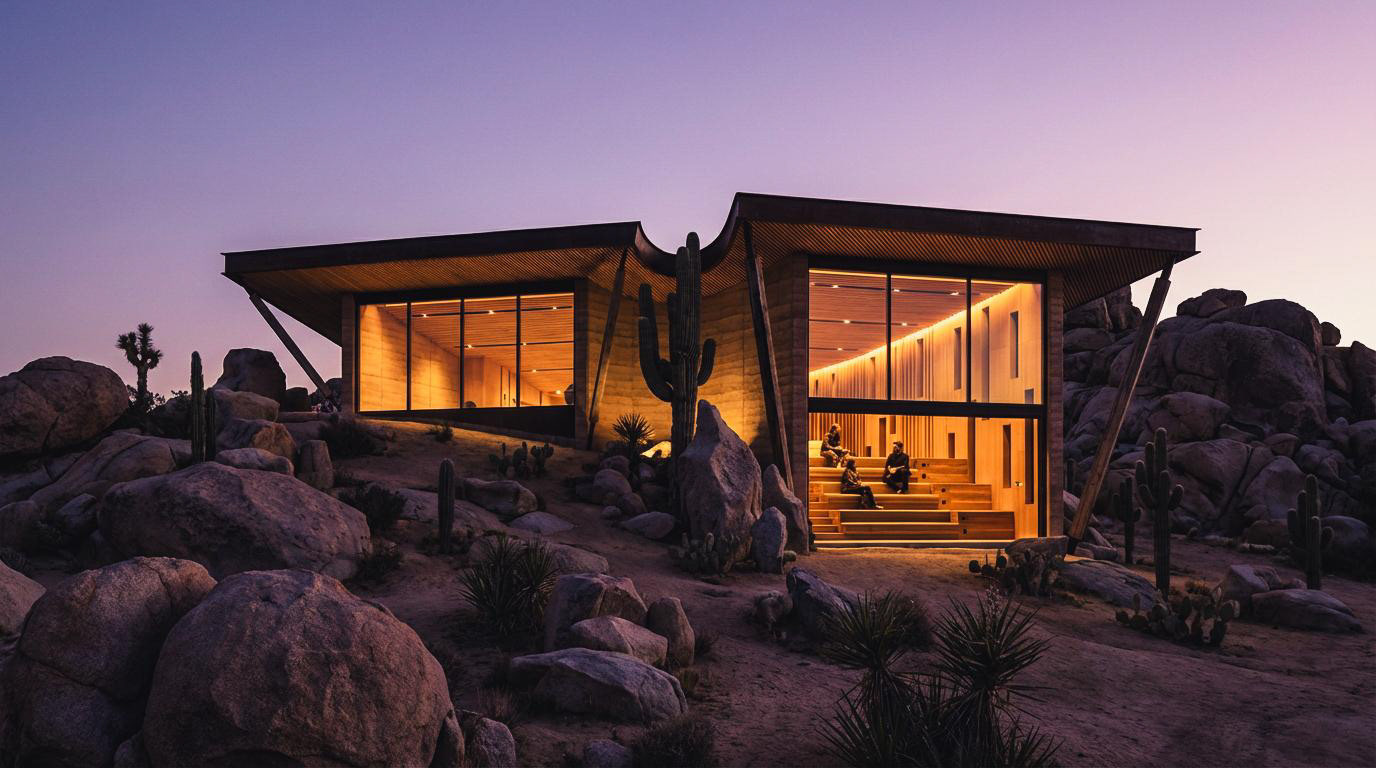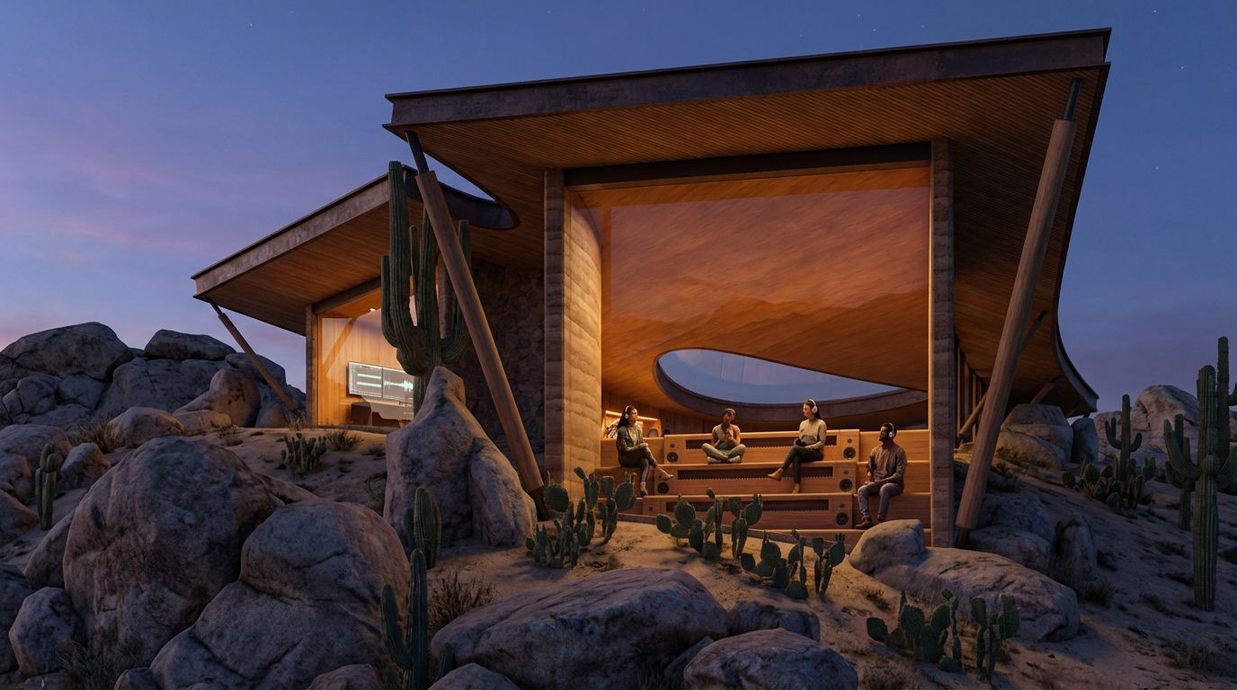 Embedded among boulders and desert flora, the structure opens itself selectively to the landscape while remaining acoustically grounded. A hovering roof plane and thick earthen walls frame a carved central void, where warm interior light contrasts with the cool desert dusk, emphasizing enclosure, calm, and intentionality.