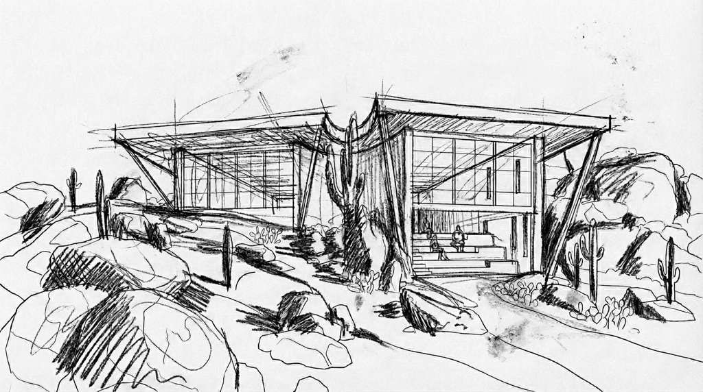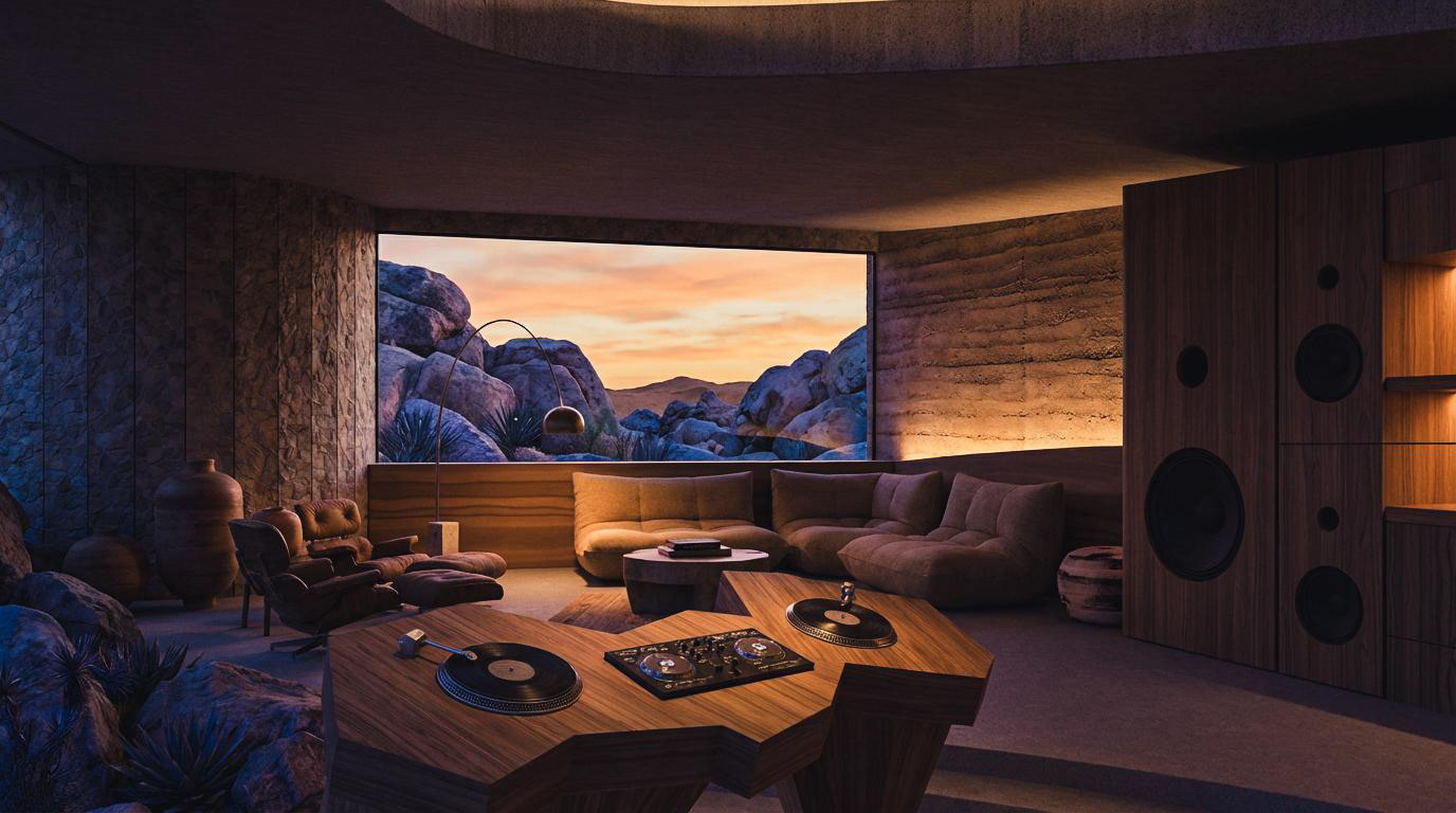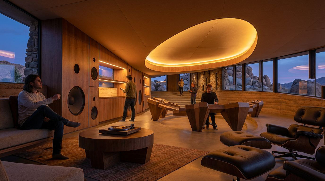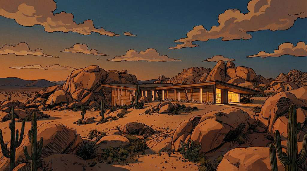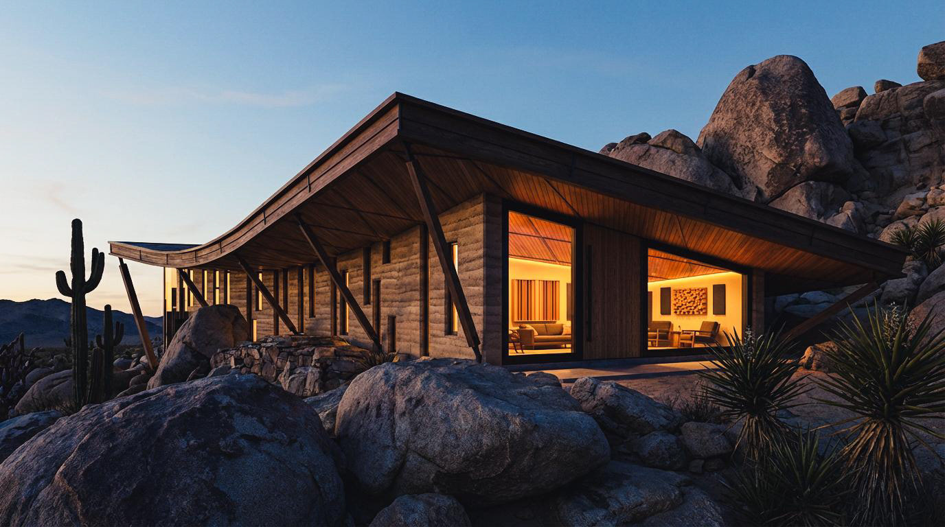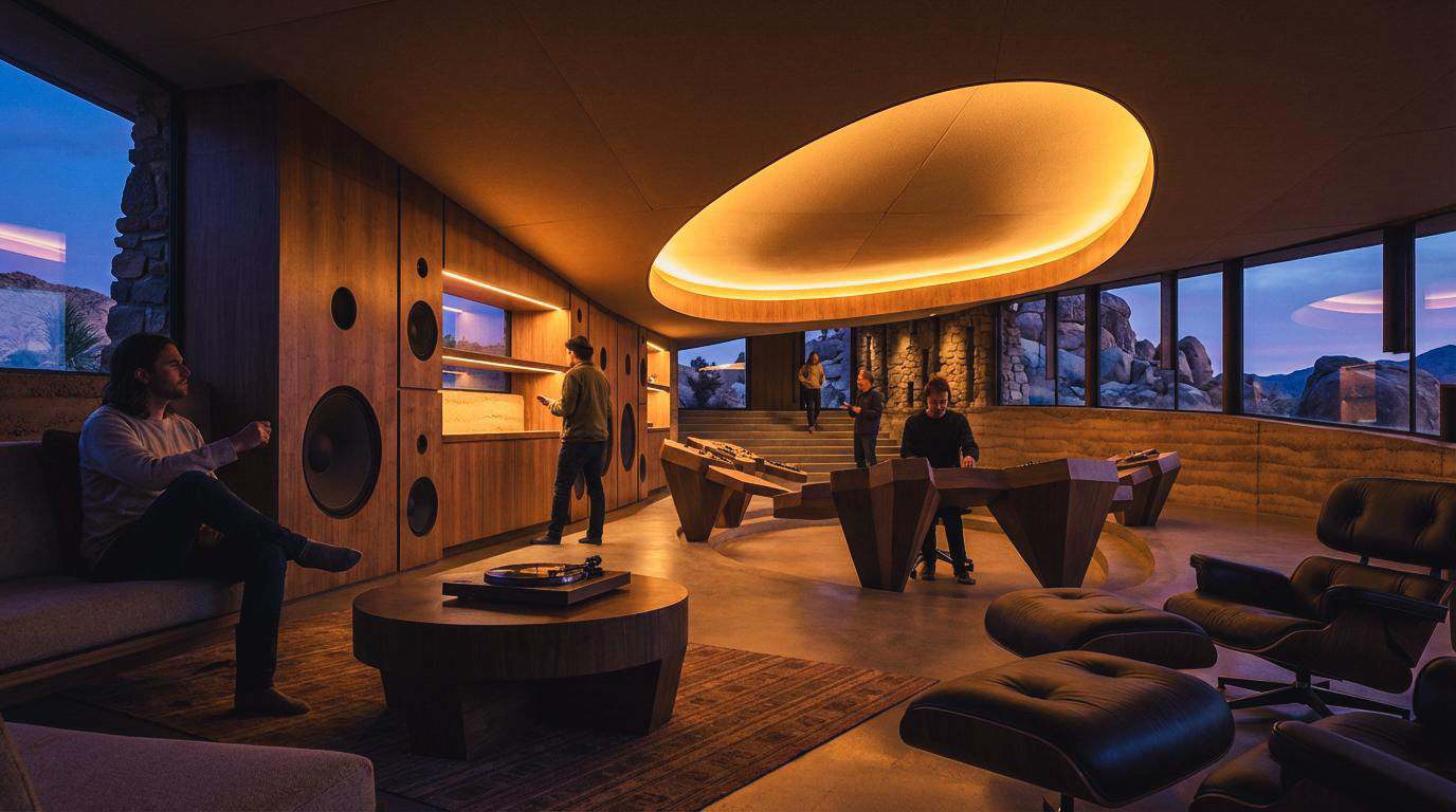 Embedded among boulders and desert flora, the structure opens itself selectively to the landscape while remaining acoustically grounded. A hovering roof plane and thick earthen walls frame a carved central void, where warm interior light contrasts with the cool desert dusk, emphasizing enclosure, calm, and intentionality.