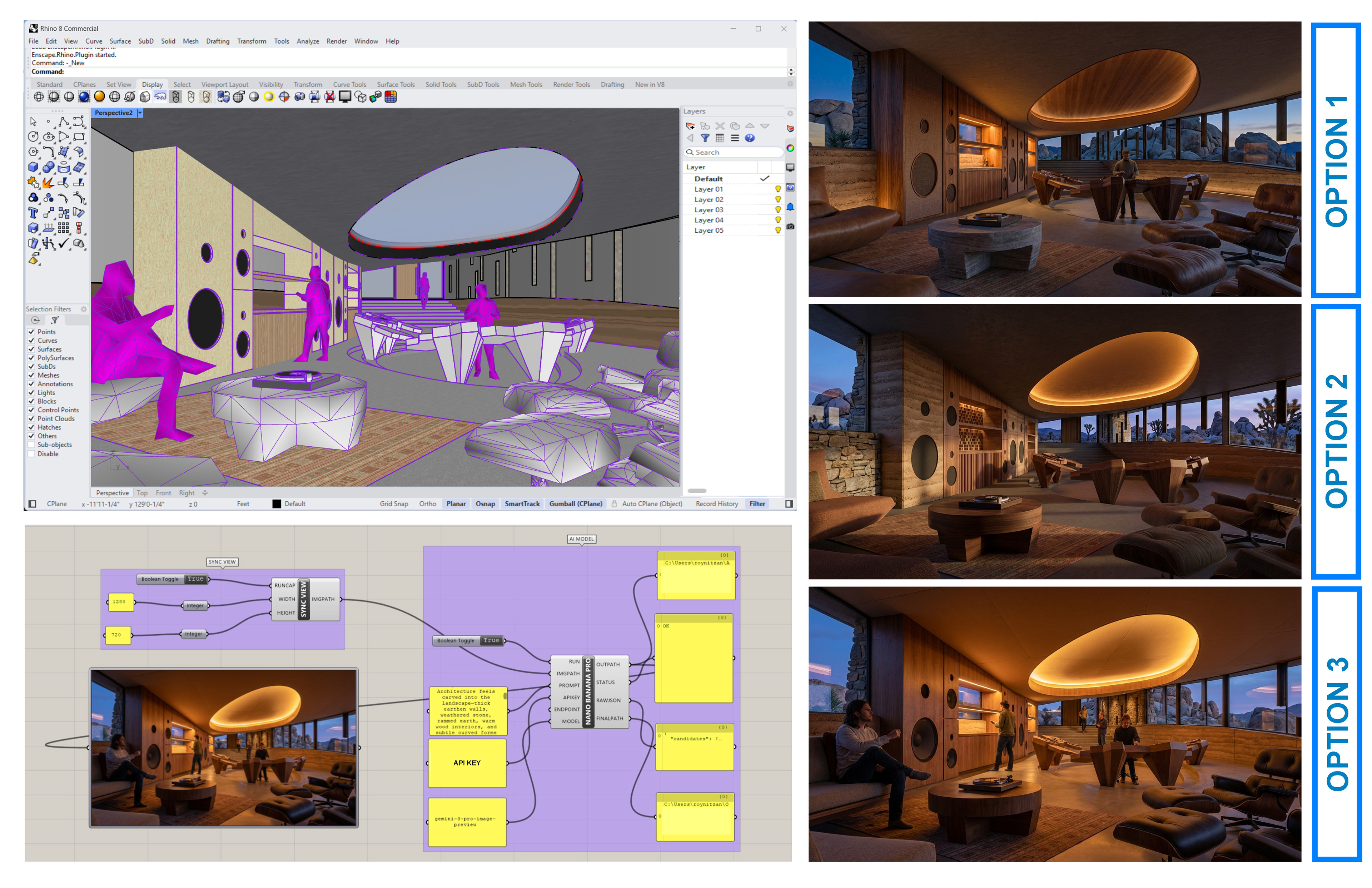 Rather than generating isolated visions, the system enables continuous iteration where form, material, and atmosphere co-develop simultaneously. References, tonal cues, and narrative intent guide the AI’s interpretation of the live model, allowing it to extrapolate experiential qualities without deviating from spatial logic. In this workflow, AI shifts from post-processing tool to design collaborator, transforming Rhino into an adaptive visualization environment where architecture and image evolve as a single, unified process.