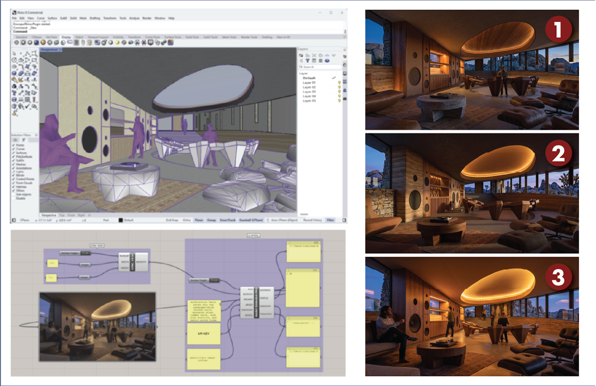 For deciBelé, generative AI was integrated natively into Rhino through Grasshopper-driven calls to Gemini (NanoBanana Pro), creating a live feedback loop between active geometry and image generation. Viewport captures were triggered directly from Grasshopper, paired with structured prompts, and sent to the model in real time—allowing AI to interpret massing, proportion, and spatial composition directly from the Rhino scene rather than from detached reference imagery.