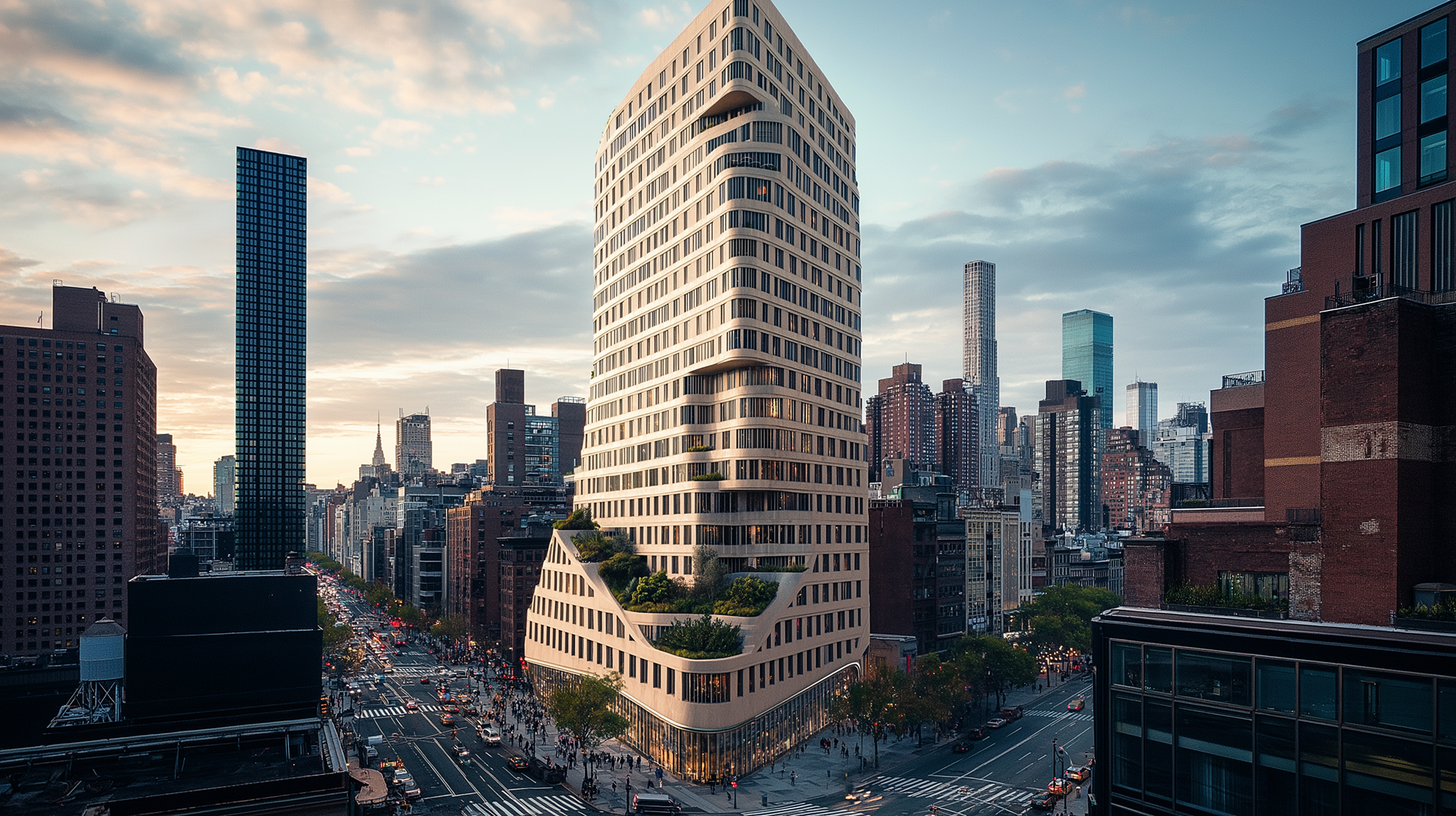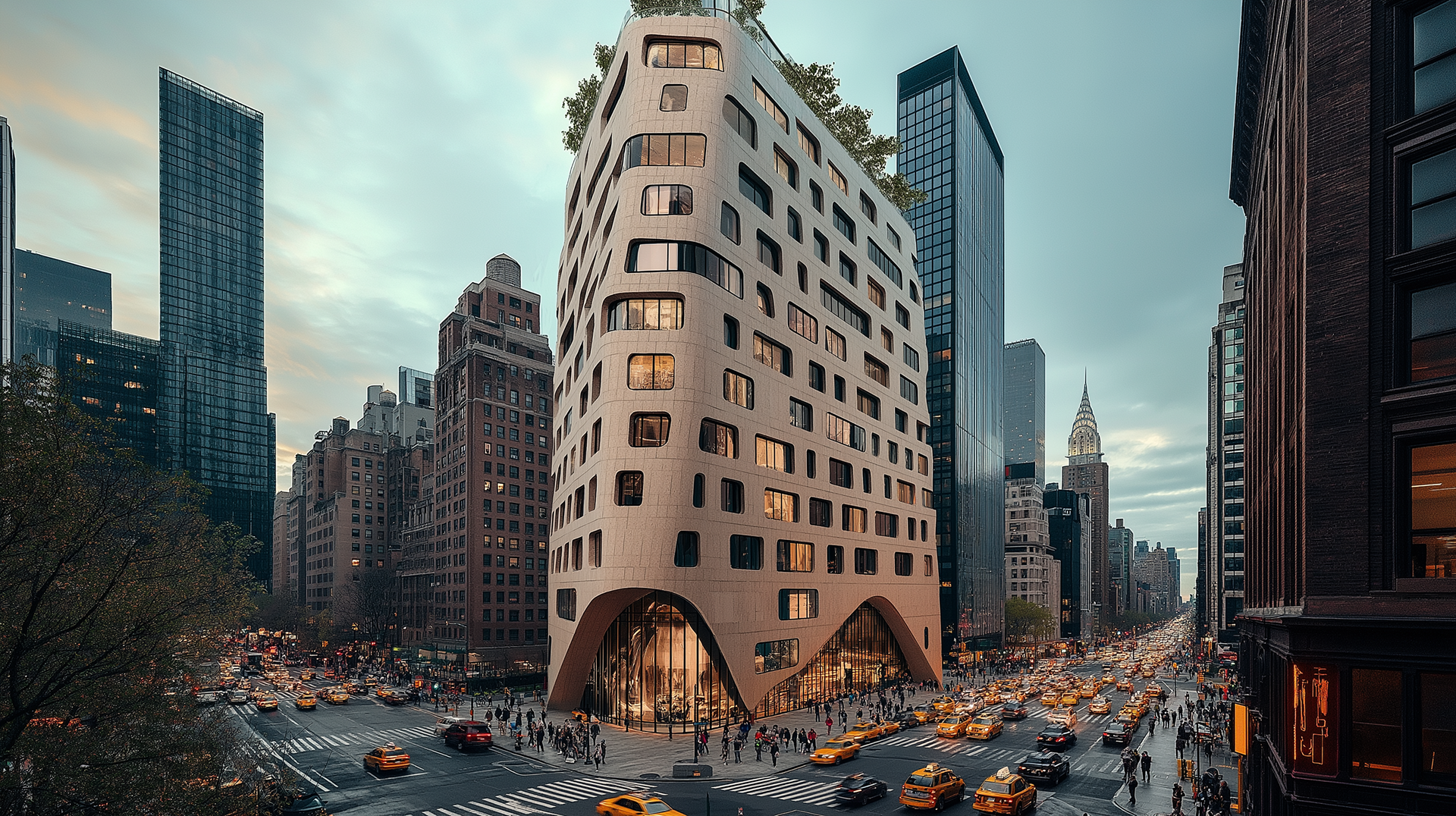 This AI-driven vision explores a contemporary reinterpretation of New York City’s iconic Flatiron Building—imagining its evolution rather than its replacement. The proposal embraces the original triangular footprint while translating its geometry into a softer, more sculptural form. Rounded corners, layered overhangs, and continuous glazing reinterpret the Flatiron’s sharp edge into a fluid, aerodynamic profile that feels grown rather than built.